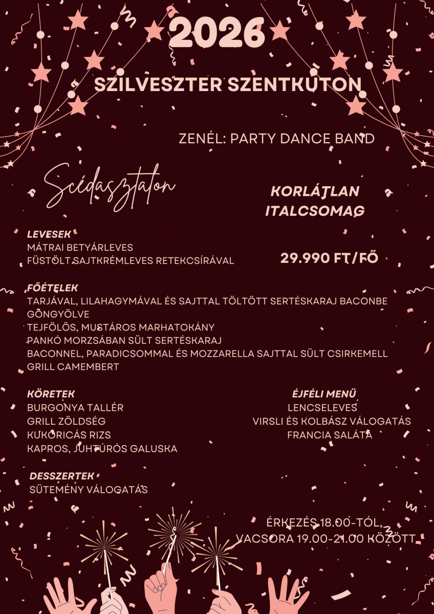 A részvételi díj 29.990 Ft/fő, amely tartalmazza a svédasztalos vacsorát bőséges választékkal, az éjféli menüt és korlátlan italcsomagot.